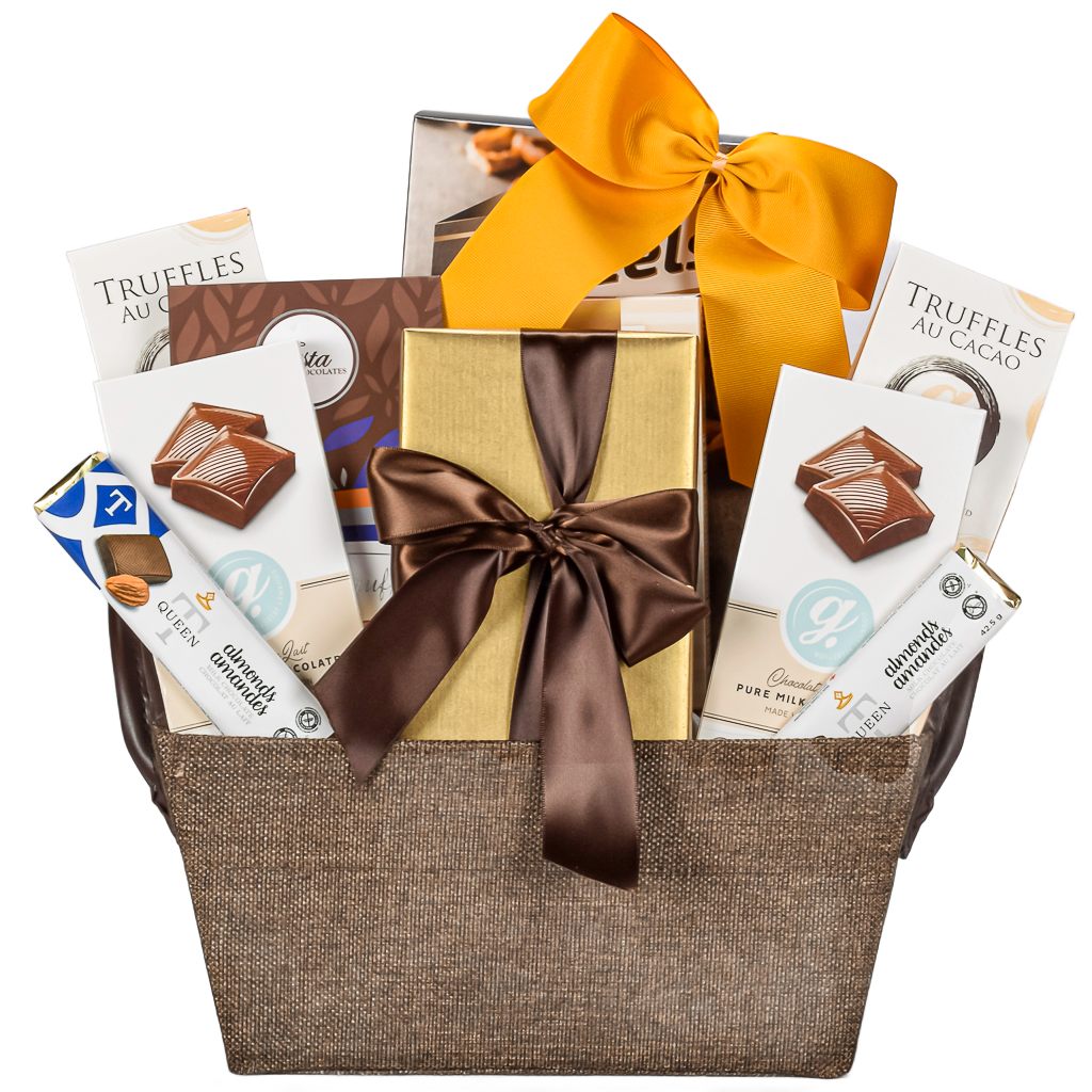 BROWN FABRIC GIFT BASKET: A stylish and reusable brown fabric basket that brings a warm, rustic charm to your gift presentation. Perfect for holding an assortment of gourmet treats or repurposing for home décor and storage.