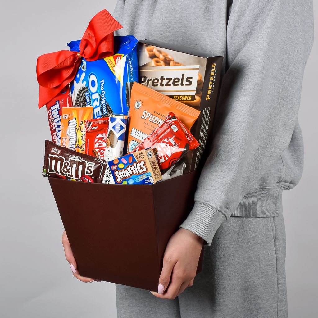This popular gift basket is one of the best gifts for every occasion! Featuring an assortment of beloved chocolates and sweet and salty treats from popular brands, this delicious selection of confections is sure to please kids and adults alike.